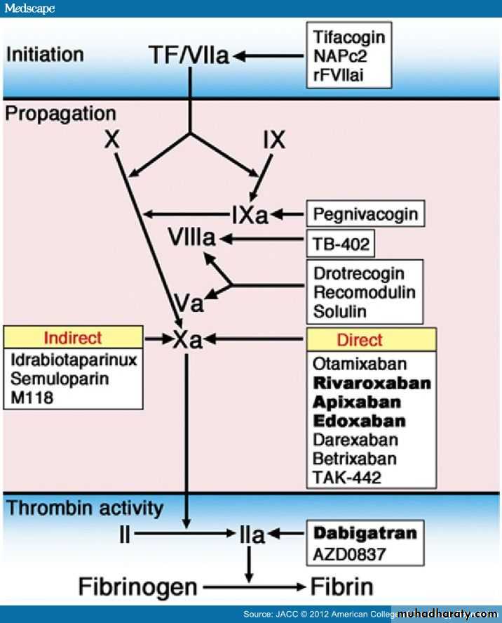 Blockers of the propagation phase also include FXa inhibitors. At variance from the parenteral indirect FXa inhibitors, such as UFH, LMWH, and pentasaccharide derivatives (fondaparinux, idrabiotaparinux), which exert their effects equally on thrombin and FXa (UFH), prevalently on FXa (LMWH), or exclusively on FXa (fondaparinux, biotaparinux), all by potentiating the natural inhibitor antithrombin (AT) (AT III), a number of oral direct (i.e., non–AT-mediated) FXa inhibitors are in clinical trials.