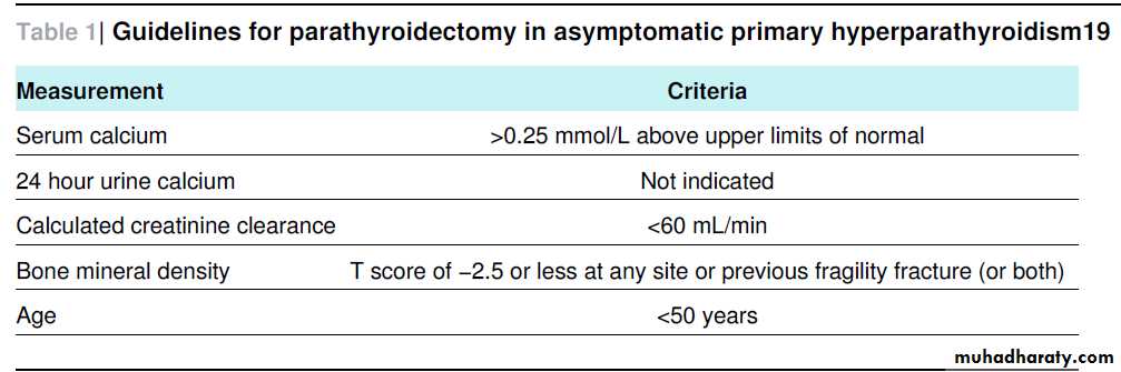 Medical management options for select patients and those who do not meet parathyroidectomy guidelines include bisphosphonates and oestrogen replacement (both provide skeletal protection) and the calcimimetic cinacalcet, which can reduce serum calcium and parathyroid hormone values