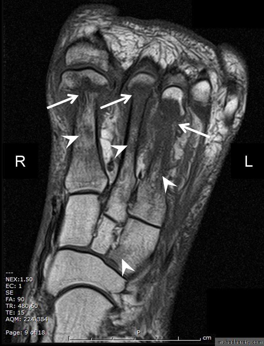 oedema in metatarsal shafts and lateral cuneiform bones (arrow heads). These features, in a patient with diabetes and no