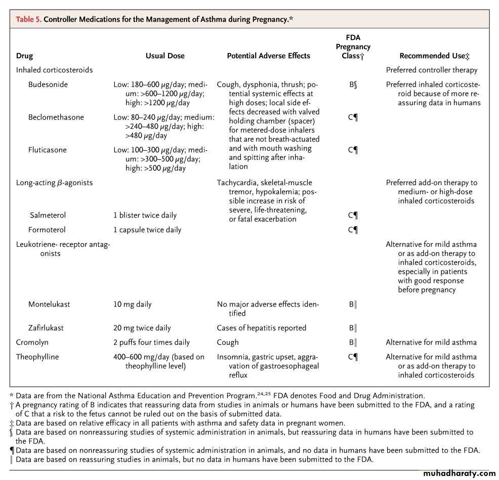 Controller Medications for the Management of Asthma during Pregnancy• The main goal of asthma treatment is to maintain sufficient oxygenation of the fetus by preventing hypoxic episodes in the mother