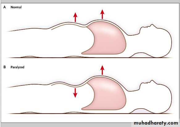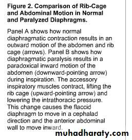 The most characteristic physical sign of diaphragmatic dysfunction is the abdominal paradox, which is the paradoxical inward motion of the abdomen as the rib cage expands during inspiration. This disordered breathing pattern results from compensatory use of the accessory inspiratory muscles of the rib cage and neck. When these muscles contract and lower pleural pressure, the weakened or flaccid diaphragm moves in a cephalad direction and the abdominal wall moves inward.This paradoxical breathing pattern is most easily seen with the patient in the supine position. The abdominal paradox is typically observed when the maximum transdiaphragmatic pressure that the patient can generate against a closed airway is less than 30 cm of water; it rarely occurs in unilateral diaphragmatic paralysis. When the abdominal paradox is present in unilateral diaphragmatic paralysis, it suggests generalized weakness of the respiratory muscles.