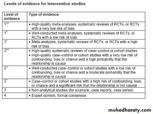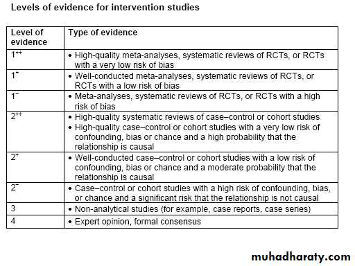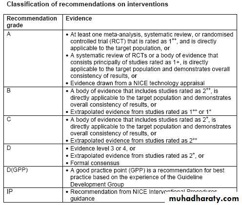 The classification of recommendations and the levels of evidence for intervention studies used in this guideline are adapted from the Scottish Intercollegiate Guidelines Network (‘SIGN 50: a guideline developers’ handbook’),The classification of recommendations and levels of evidence for the accuracy of diagnostic tests are adapted from ‘The Oxford Centre for Evidence-Based Medicine levels of evidence’ (2001) and the ‘Centre for Reviews and Dissemination report No. 4’ (2001).