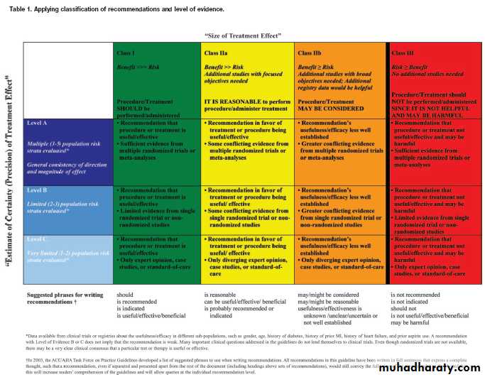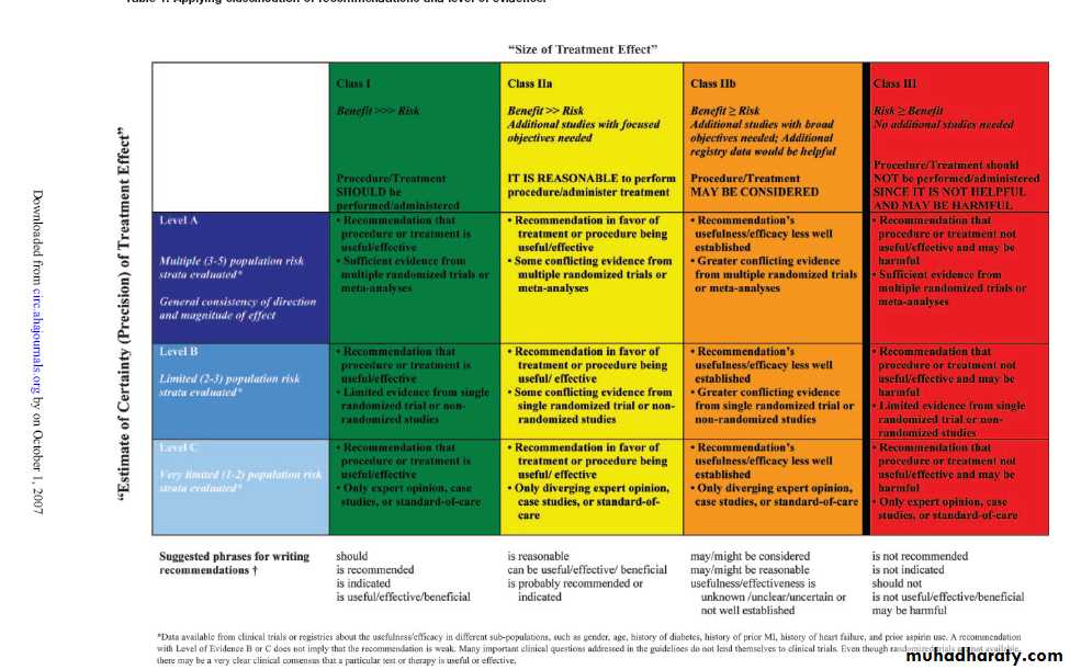 All of the recommendations in this guideline update were converted from the tabular format used in the 2002 guidelines to a listing of recommendations that has been written in full sentences to express a complete thought, such that a recommendation, even if separated and presented apart from the rest of the document, would still convey the full intent of the recommendation. It is hoped that this will increase the reader’s comprehension of the guidelines. Also, the level of evidence, either an A, B, or C, for each recommendation is now providedGrading scheme