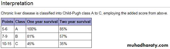 • Child-Pugh Score: Interpretation:Class A: 5-6Class B: 7-9Class C: 10-15