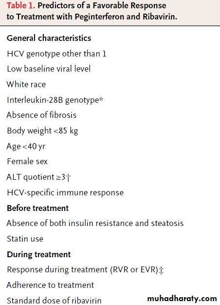 for whom the duration of therapy can be shortened without compromising the virologic response.A recent metaanalysis of seven randomized trials has shown that genotype 1–infected patients with a low baseline HCV RNA level (<400,000 IU per milliliter) who have a rapid virologic response may discontinue therapy at 24 weeks rather than continue for the standard 48 weeks.32 A reduction of the treatment duration has the added benefits of decreased costs and side effects.