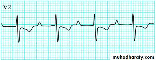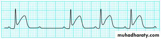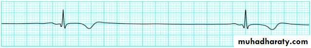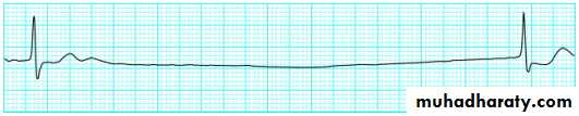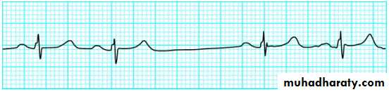 This term applies to complete dissociation between atrial and ventricular depolarisations. The atria often depolarise at a normal rate, while ventricular depolarisation is initiated from a pacemaker within the ventricles themselves, giving a slower depolarisation rate and wide QRS complexes. There are therefore always more P waves than QRS complexes and no consistent relationship between the two. The precise morphology of the QRS complex will vary depending on the location of the pacemaker within the ventricle. The contraction rate of the ventricles without pacemaker activity from the atria is around 40 beats per minute (Figure 7).