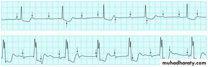 • Figure 7. Third degree heart block. (Arrows show P waves) Top: a pacemaker in the bundle of His produces a narrow QRS complex. Bottom: more distal pacemakers tend to produce broader complexes.