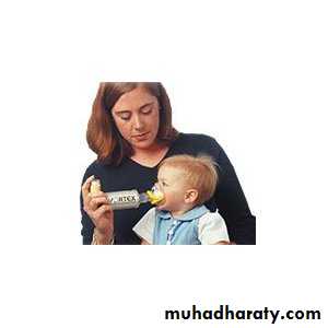 Baby using inhaler and spacer.