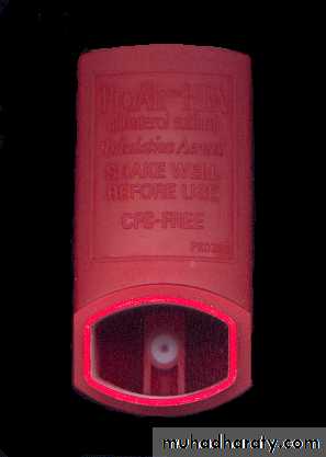 A metered-dose inhaler (MDI) is a device that delivers a specific amount of medication to the lungs, in the form of a short burst of aerosolized medicine that is inhaled by the patient. It is the most commonly used delivery system for treating asthma, chronic obstructive pulmonary disease (COPD) and other respiratory diseases. The medication in a metered dose inhaler is most commonly a bronchodilator, corticosteroid or a combination of both for the treatment of asthma and COPD. Other medications less commonly used but also administered by MDI are mast cell stabilizers, such as (cromoglicate or nedocromil).