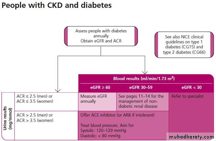 In people with chronic kidney disease and diabetes, and also in people with an urine albumin:creatinine ratio 70 mg/mmol or more (approximately equivalent to protein:creatinine ratio 100 mg/mmol or more, or urinary protein excretion 1 g/24 h or more) aim to keep the systolic blood pressure below 130 mm Hg (target range 120-129 mm Hg) and the diastolic blood pressure below 80 mm Hg.