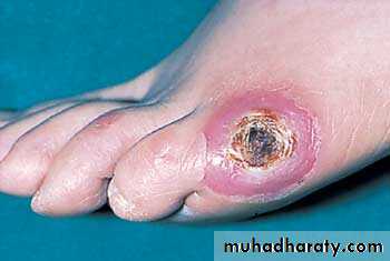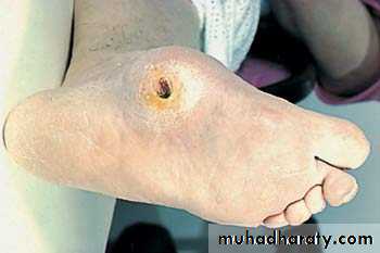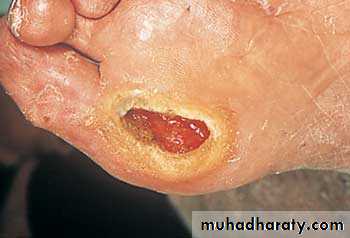 This is a classic neuropathic ulcer. It is punched out and is situated on the sole of the foot underneath the heads of the metatarsals.