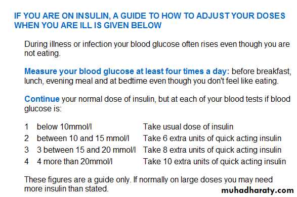 When patients are unwell they need to be aware of the sick day rules.Never stop taking insulin even if not eating. There may be a need to increase the dose