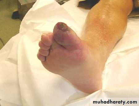 ColourRedness of the foot may indicate cellulitis, critical ischaemia, Charcot foot.Redness of the toes may indicate cellulitis, osteomyelitis, ischaemia, chilblain.Blue discoloration of the foot may indicate cardiac failure, chronic obstructive airways disease, venous insufficiency.Blue discoloration of the toe may indicate severe infection or ischaemia.A white foot, especially on elevation, may indicate ischaemia.Black areas may indicate ischaemia, emboli, tumour, application of henna .