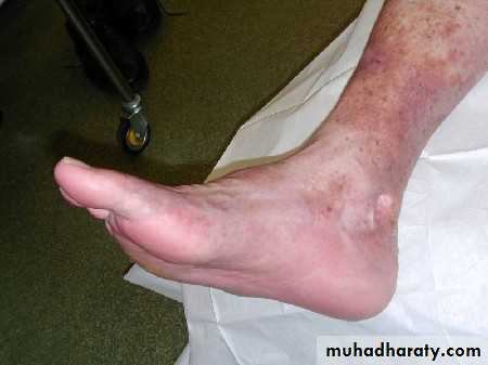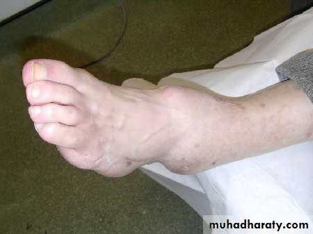 like hammer toe and claw toes should be noted as they are likely to cause pressure on footwear and subsequent ulceration. The Charcot foot is a specific deformity resulting in bone and joint destruction. Patients who develop Charcot's osteoarthropathy may have symptoms of peripheral or autonomic neuropathy. In its acute stage it often follows recent trauma, presenting with a unilateral erythema and swelling, with the affected foot being at least 2° hotter than the unaffected foot.The following picture shows a typical late stage Charcot deformity.
