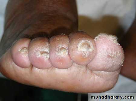 • Figure 1: A neuroischaemic ulcer. Note the absence of callus and the marginated ulcer on tip of toe