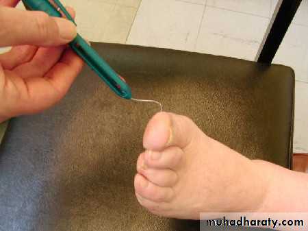 Figure 3: Using a 10 g monofilament to test for protective pain sensation