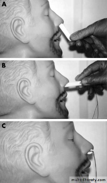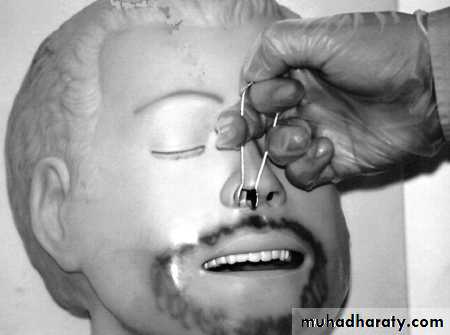 • Lubricate the Merocel pack with a generous amount of K-Y jelly or Naseptin cream• Remember that the floor of the nasal cavity extends horizontally so advance your pack in the manner shown in figure 4