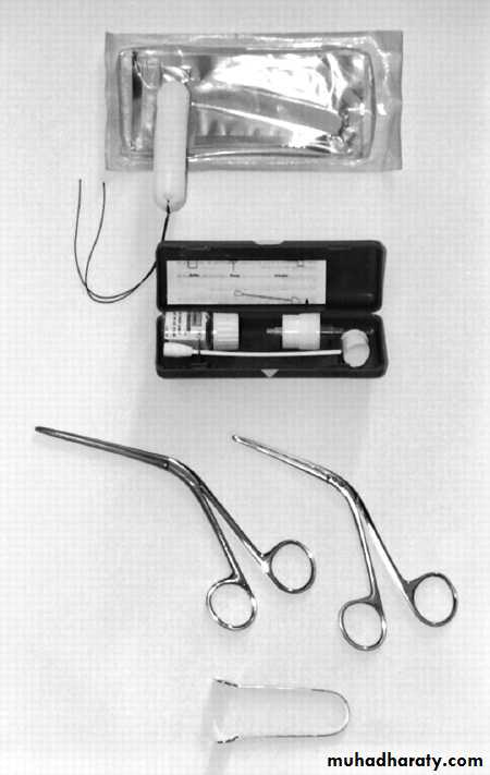 • Figure 3 Equipment required for Merocel packing. Top to bottom: Merocel pack, lidocaine/phenylephrine spray, forceps, nasal speculum.