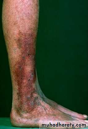 Lichen simplex is a well developed thickened plaque with marked accentuation of the skin creases that develops due to continuous rubbing and scratching (Figure 2). Postinflammatory hyper- or hypopigmentation can happen. The common distribution of lichenified plaques is in areas where the patient can easily scratch and rub (the nape of the neck, below the elbow and the ankle, buttock and genitalia).Figure 2. Lichenified plaques in a patient with localised itch with stasis dermatitis
