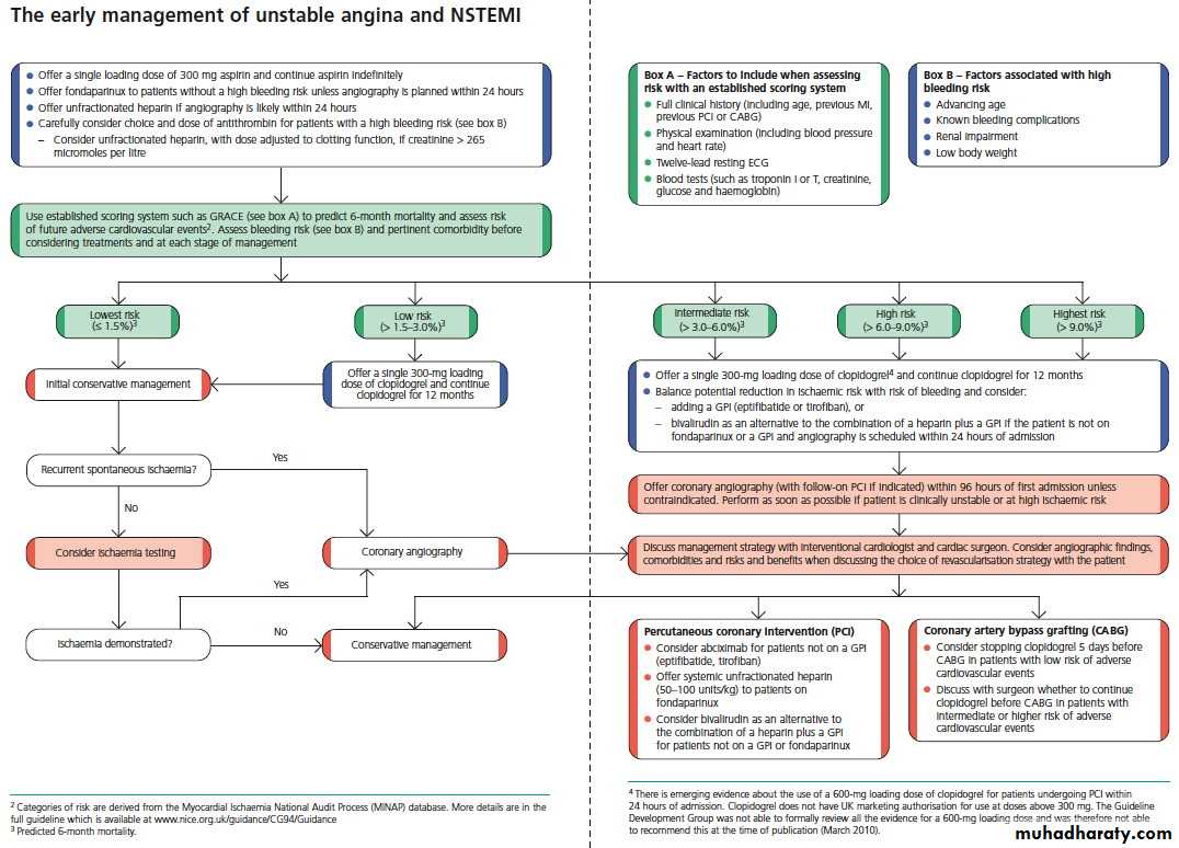 • As soon as the diagnosis of unstable angina or NSTEMI is made, and aspirin and antithrombin therapy have been offered, formally assess individual risk of future adverse cardiovascular events using an established risk scoring system that predicts six month mortality (for example, Global Registry of Acute Cardiac Events (GRACE)).Include in the formal risk assessment: