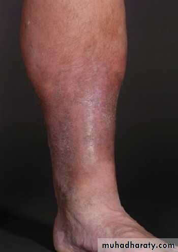 Is venous hypertension damaging the skin? This is the most important aspect of examination. Is there any sign of eczema or lipodermatosclerosis on the lower leg? Skin pigmentation is obvious but you may only appreciate liposclerosis (scarring and contraction of the subcutaneous fat) by gentle palpation, and perhaps by comparison with the consistency of the subcutaneous fat of the other leg.