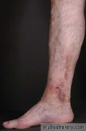 • Figure 4: Typical venous ulcer over medial malleolus with associated lipodermatosclerosis and varicose veins.
