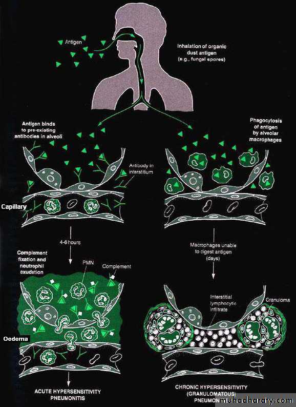 In extrinsic allergic alveolitis, an antigen-antibody reaction occurs in the acute phase and leads to acute hypersensitivity pneumonitis.If exposure continued, this is followed by a sub-acute phase, with the formation of granulomas and chronic interstitial pneumonitis.