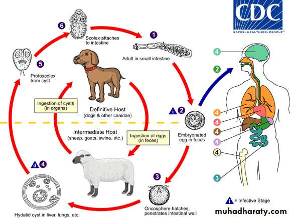 Dogs are the definitive hosts .The larval stage, a hydatid cyst, normally