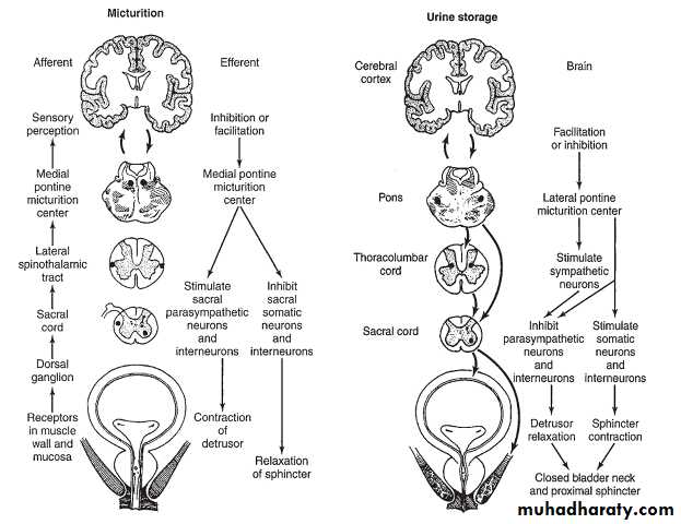 Intact reflex pathways via the spinal cord and the pons are required for normal micturition. Afferents from the bladder are essential for the activation of the sacral center, which then causes detrusor contraction, bladder neck opening, and sphincteric relaxation.The pontine center, through its connection with the sacral center, may send either excitatory or inhibitory impulses to regulate the micturition reflex.