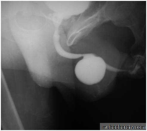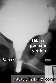 Ultrasound scan of kidneys and bladder.VCUG shows distended and elongated posterior urethra; partially filled anterior urethra; bladder neck hypertrophy; lucencies representing valve leaflets; thick-walled bladder (±diverticuli); incomplete bladder emptying; reflux (50%).