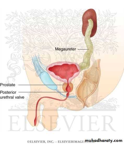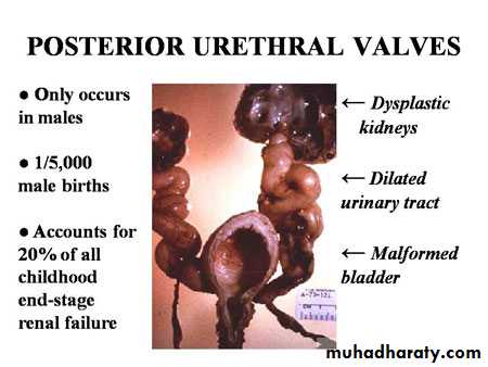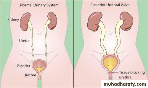 A posterior urethral valve is an obstructing membrane in the posterior male urethra as a result of abnormal embryological development and it is the most common cause of bladder outlet obstruction in male neonate.The embryological abnormality giving rise to posterior urethral valves is thought to represent either an anomalous insertion of the mesonephric duct into the uro-genital sinus, preventing normal migration of these ducts and their anterior fusion or a consequence of an abnormality of the cloacal membrane.