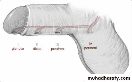 Posterior (or proximal)—penoscrotal, scrotal, and perineal (~20%)