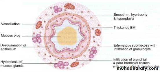 The airways are edematous & infiltrated with eosinophils( which seems to play an important role), neutrophils , & lymphocytes .