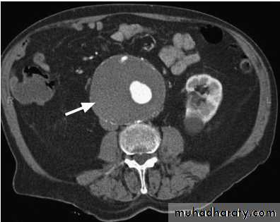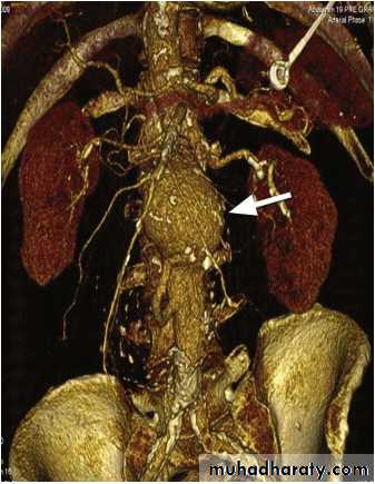 CT will provide much more accurate information about the size and extent of the aneurysm, the surrounding structures and whether there is any other intra-abdominal pathology, and is the standard pre-operative investigation; however, it is not suitable for surveillance.Arteriography is usually only indicated if there are concerns about associated lower limb, renal and/or visceral occlusive disease.