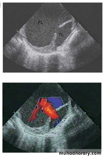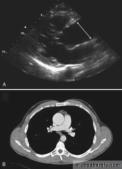 InvestigationsDoppler echocardiography may show aortic regurgitation, a dilated aortic root and, occasionally, the flap of the dissection. Transoesophageal echocardiography is particularly helpful because transthoracic echocardiography can only image the first 3-4 cm of the ascending aorta. CT and MRI are both highly specific, and angiography of the aortic arch is not usually required unless these techniques are not available.