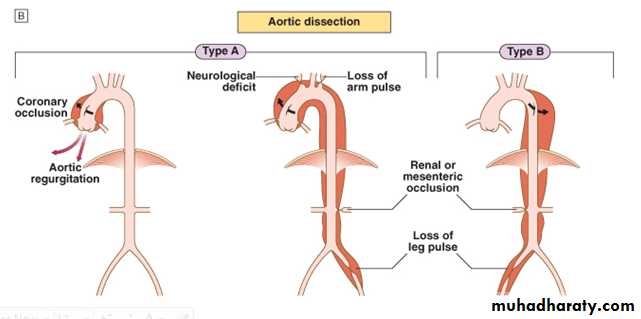 Clinical featuresThere may be asymmetry of the brachial, carotid or femoral pulses, and the signs of aortic reflux may be present in type A dissections. Occlusion of aortic branches may cause a variety of complications including myocardial infarction (coronary), paraplegia (spinal), mesenteric infarction with an acute abdomen (coeliac and superior mesenteric), renal failure (renal) and acute limb (usually leg) ischaemia.