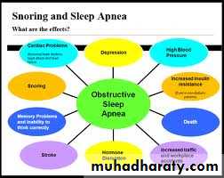 So, if there is a slight narrowing of this opening, snoring will develops (snoring is present in 40% of males & 20% of females). & if the narrowing is so severe, occlusion or near occlusion of the upper airways opening, no air will get in, & this will stimulate the respiratory center due to hypoxia & hypercapnia, & this will send a signal to the respiratory muscles to perform more work, this will awake the patient, then the patient sleeps, leading to “Apnea”, & again awake the patient. This condition is repeated many times during sleep, so the patient will not get enough sleep, with the tendency to develop HTN, IHD, & Stroke.
