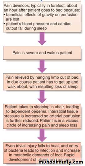 Intermittent claudicationResumption of walking leads to a return of the pain. Most patients describe a cyclical pattern of exacerbation and resolution due to the progression of disease and the subsequent development of collaterals. The annual mortality rate exceeds 5%, which is 2-3 times higher than an equivalent non-claudicant population due to the fact that IC is nearly always found in association with widespread atherosclerosis. Most claudicants succumb to MI or stroke.