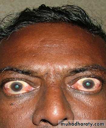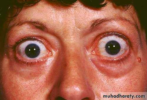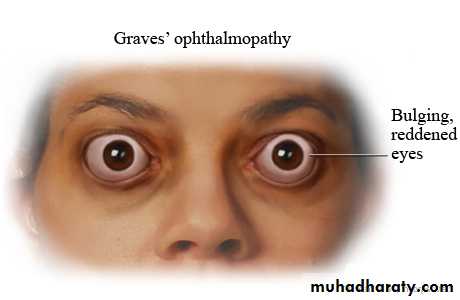 Grave's disease may be associated with eye disease (Graves' ophthalmopathy) and skin lesions (dermopathy). Ophthalmopathy can occur before, after, or at the same time as the hyperthyroidism. Early on, it may cause sensitivity to light and a feeling of "sand in the eyes." The eyes may protrude and double vision can occur. The degree of ophthalmopathy is worsened in those who smoke. The course of the eye disease is often independent of the thyroid disease, and steroid therapy may be necessary to control the inflammation that causes the ophthalmopathy. In addition, surgical intervention may be required. The skin condition (dermopathy) is rare and causes a painless, red , lumpy skin rash that appears on the front of the legs.
