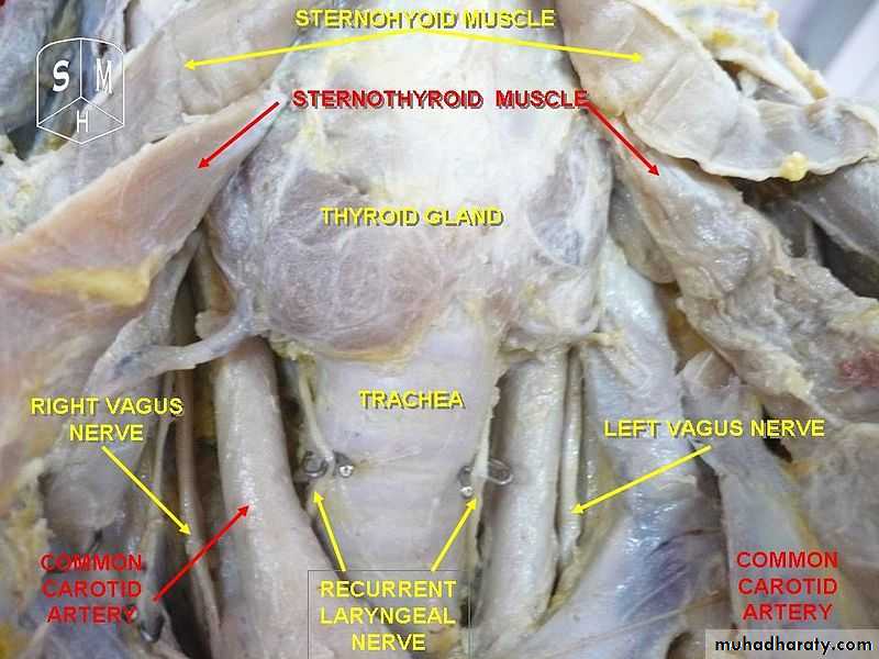 Lymphatic drainage passes frequently the lateral deep cervical lymph nodes and the pre- and parathracheal lymph nodes. The gland is supplied by parasympathetic nerve input from the superior laryngeal nerve and the recurrent laryngeal nerve.