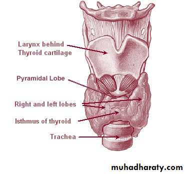 Anatomy :The thyroid gland is a butterfly-shaped organ and is composed of two cone-like lobes or wings, lobus dexter (right lobe) and lobus sinister (left lobe), connected via the isthmus. The organ is situated on the anterior side of the neck, lying against and around the larynx and trachea, reaching posteriorly the oesophagus and carotid sheath. It starts cranially at the oblique line on the thyroid cartilage (just below the laryngeal prominence, or 'Adam's Apple'), and extends inferiorly to approximately the fifth or sixth tracheal ring. It is difficult to demarcate the gland's upper and lower border with vertebral levels because it moves position in relation to these during swallowing. Between the two layers of the capsule and on the posterior side of the lobes, there are on each side two parathyroid glands.