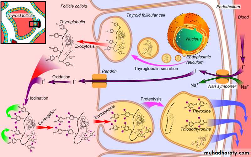 Thyroxine (T4) is synthesised by the follicular cells from free tyrosine and on the tyrosine residues of the protein called thyroglobulin (Tg). Iodine is captured with the "iodine trap" by the hydrogen peroxide generated by the enzyme thyroid peroxidase(TPO) and linked to the 3' and 5' sites of the benzene ring of the tyrosine residues on Tg, and on free tyrosine. Upon stimulation by the thyroid-stimulating hormone (TSH), the follicular cells reabsorb Tg and cleave the iodinated tyrosines from Tg in lysosomes, forming T4 and T3 (in T3, one iodine atom is absent compared to T4), and releasing them into the blood. Deiodinase enzymes convert T4 to T3. Thyroid hormone secreted from the gland is about 80-90% T4 and about 10-20% T3. T3 can activate phosphatidylinositol 3-kinase by a mechanism that may be cytoplasmic in origin or may begin at integrin alpha V beta3.