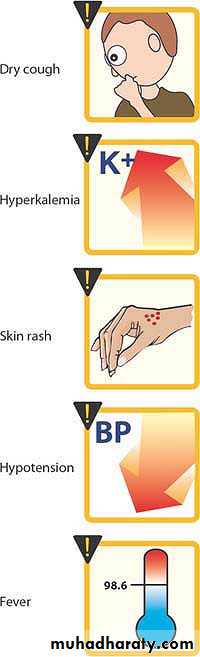 Therapeutic uses:1. Dry cough, rash, fever, altered taste, hypotension, and Hyperkalemia.