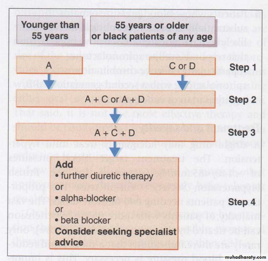if the patient is on an ACE inhibitor add a Calcium channel blocker or thiazide Diuretic (A+C or A+D),TREATING HYPERTENSION