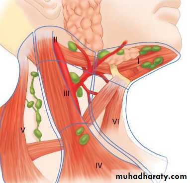 Level V-posterior triangle nodes drain the occipital and retro-auricular node, parietal and occipital scalp, nasopharynx, the oropharynx and the thyroid gland. Level VI—anterior compartment nodes. composed of the pre-laryngeal, pre-tracheal (delphen LN)and para-tracheal (recurrent laryngeal nerve) nodes drain the anterior floor of mouth, the tip of the tongue, the lower lip,, the glottic and subglottic larynx, the hypopharynx, thyroid glandnd the cervical esophagus.Level VII: contains the mediastinal lymph node drains esophagus