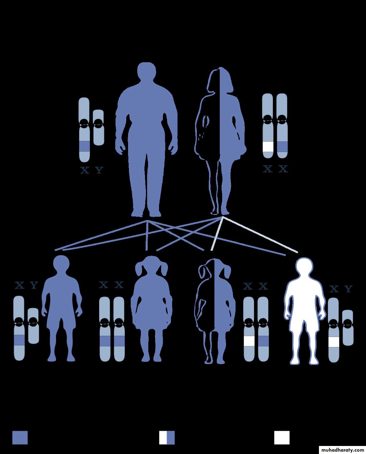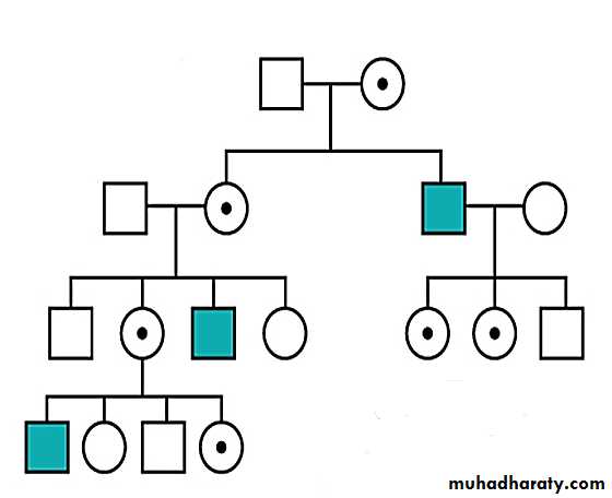 • Trait is transmitted from affected males to all of their daughters; it is never transmitted father to son because they pass their X chromosome to all of their daughters and their Y chromosome to all of their sons.