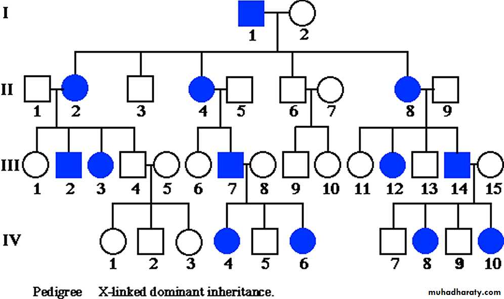 Only few X linked dominant disorders have been described.Both male and female affected, but female have less severe symptoms due to X- chromosome inactivation, e.g. hypophsphatemic rickets.