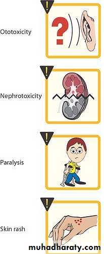 1- Ototoxicity(Vestibular and Cochlear )related to high peak plasma level and duration of treatment : deafness may be irreversible .