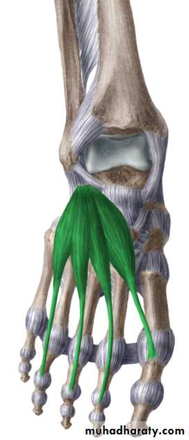 Extensor digitorum brevis muscle: originates at the calcaneus and divides into three muscle bellies whose tendons insert at the dorsal aponeurosis and the middle phalanges of the second to fourth toes.Extensor hallucis brevis muscle
