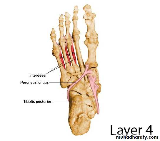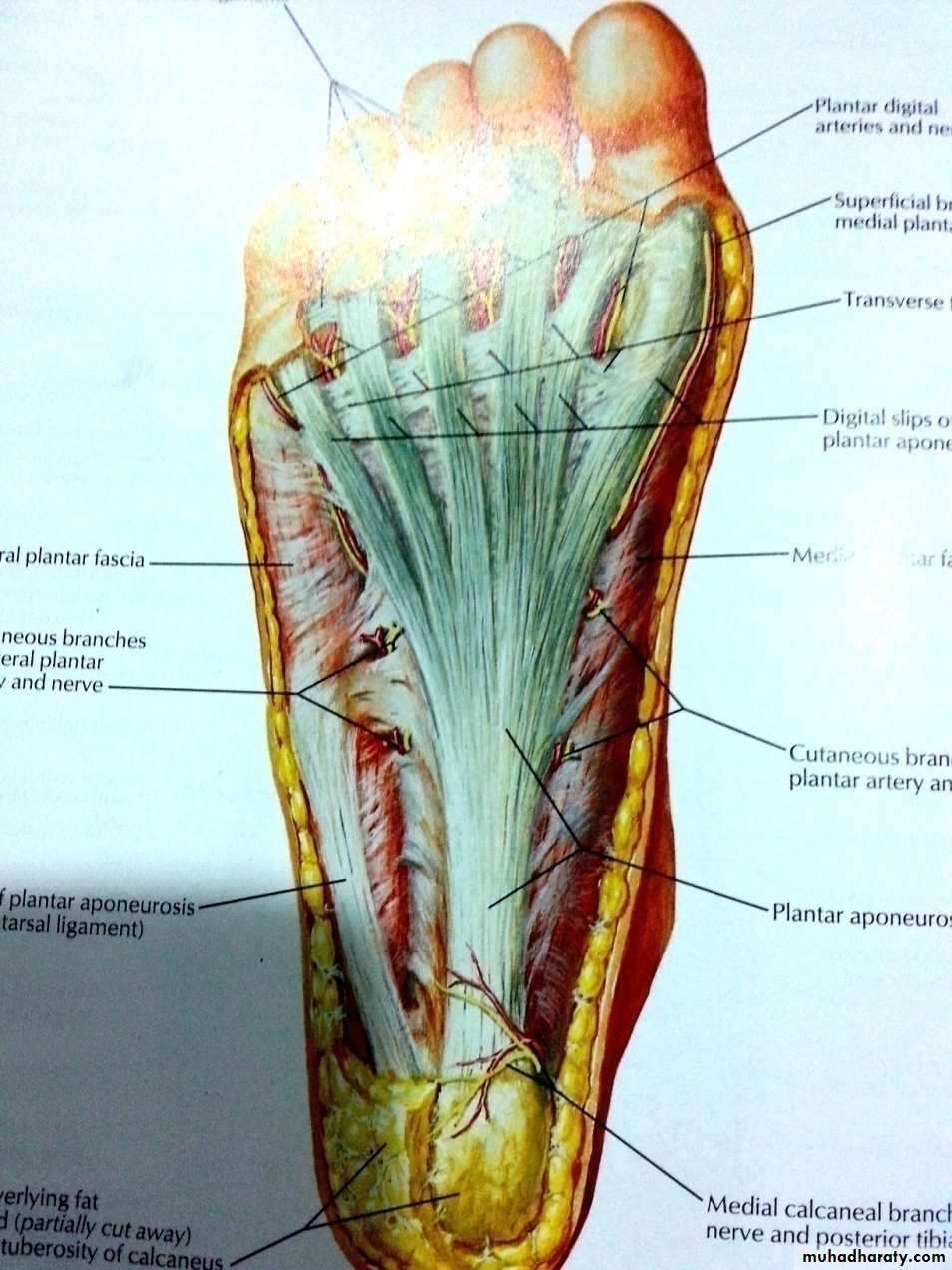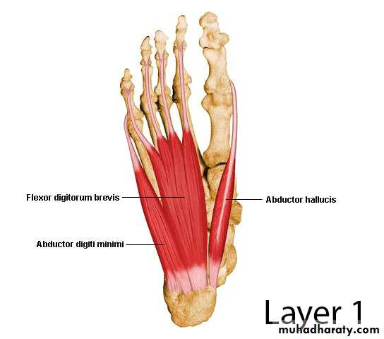 first layer ( most superficial layers) contains 3 muscles: ,abductor hallucis ,flexor digitorum brevis (FDB) ,bductor digiti minimi2nd layer contains 2 Muscles and 2 tendonand Neurovascular structures medial and lateral plantar arteries